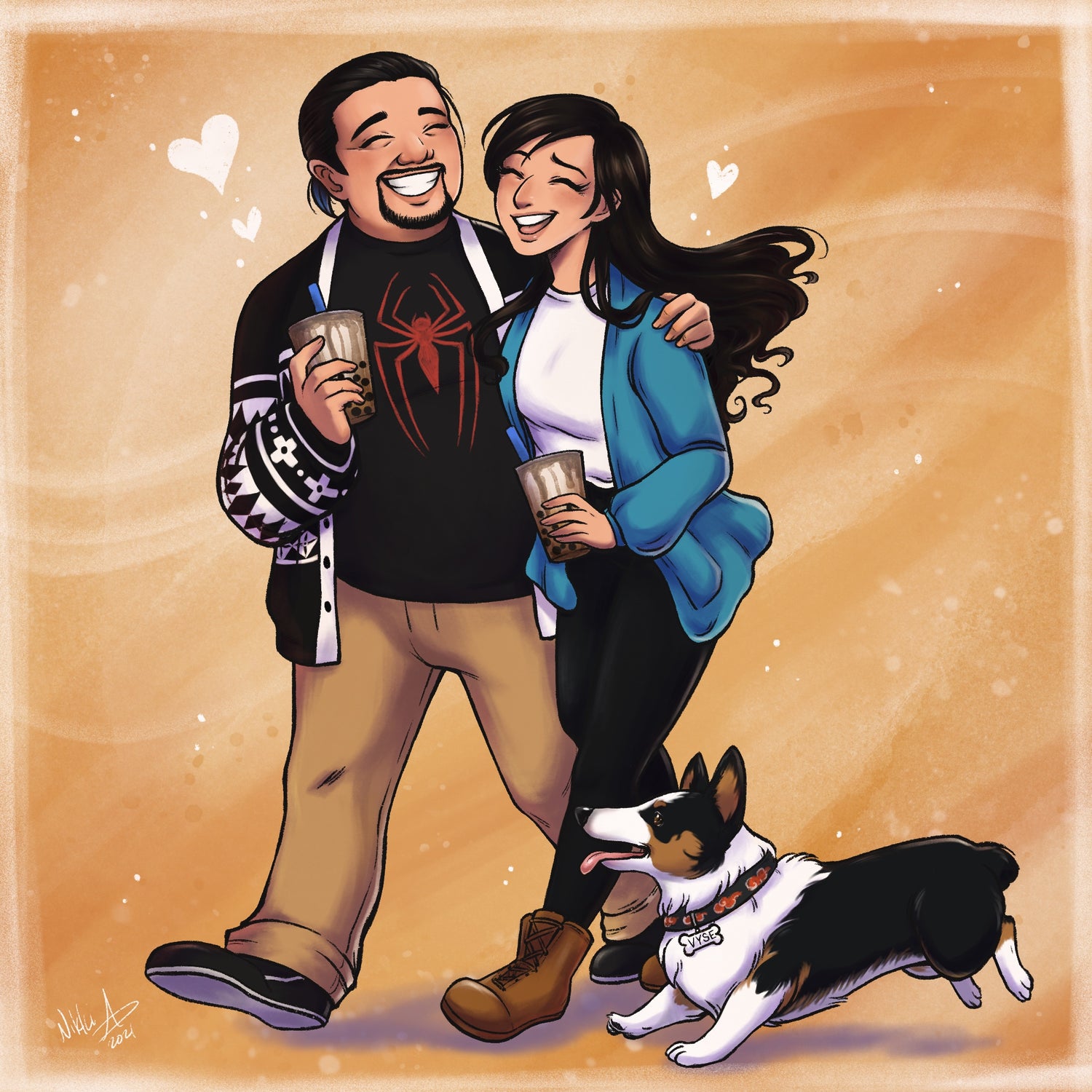 When I'm not drawing, I love hanging out with my husband, Will and our corgi, Vyse, watching movies, playing videogames, and enjoying a delicious boba drink or iced coffee.